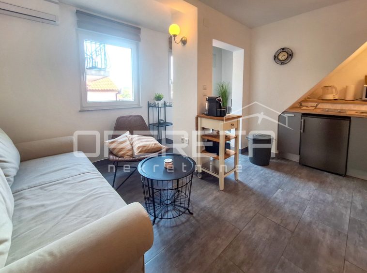 An internal staircase leads to apartment no. 2, where 17 square meters have a kitchenette, a bathroom and a living room with a bed.