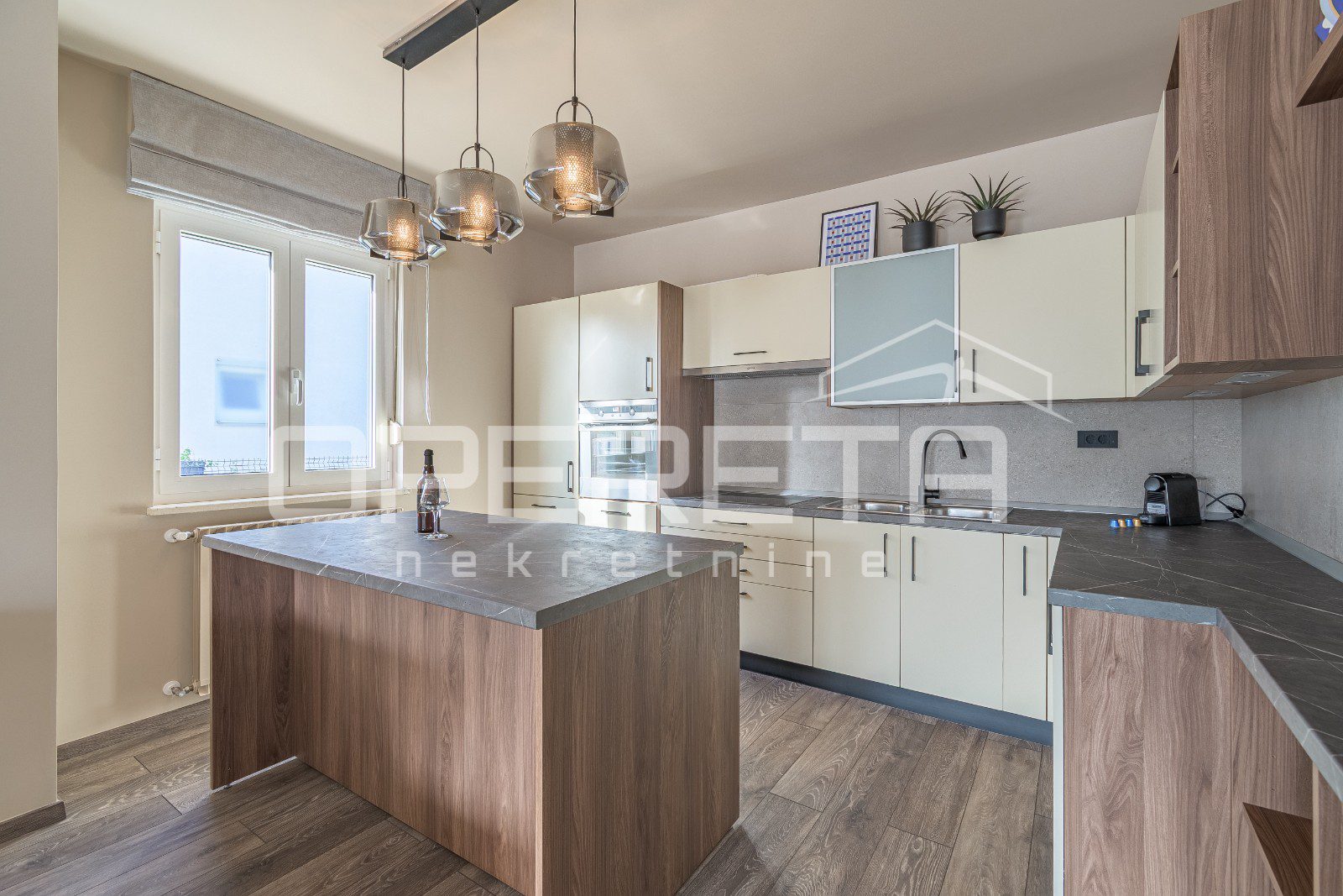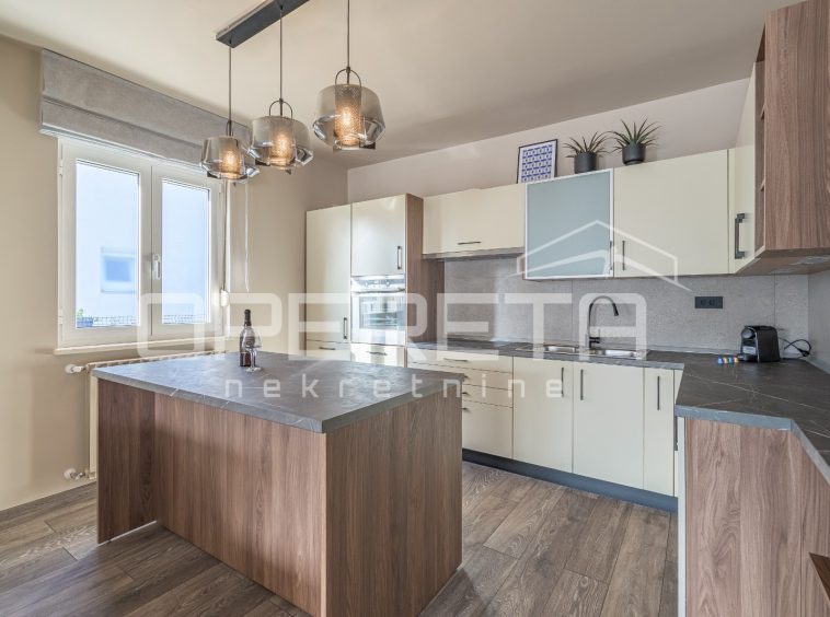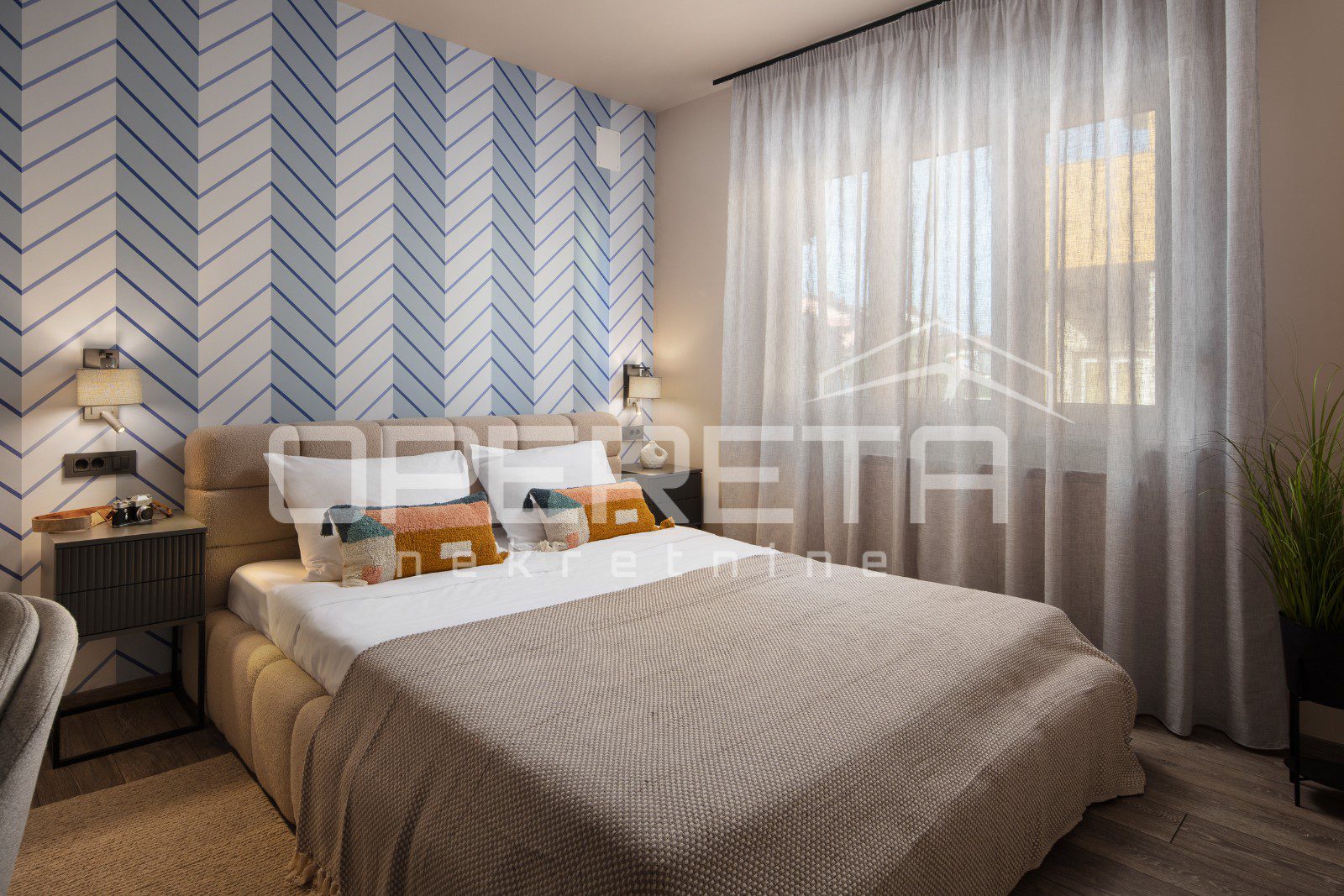 The beautifully landscaped and fenced yard includes a private swimming pool with lighting and hydromassage function, sunbathing area, barbecue, garden, and two parking spaces within the property.