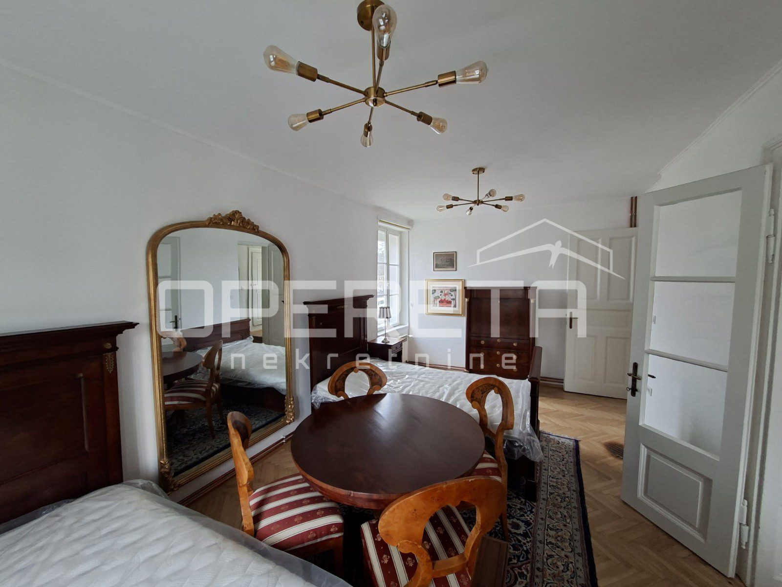 Restored Empire and Biedermeier furniture on the first floor is available for purchase upon request.