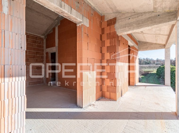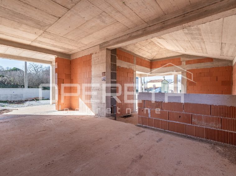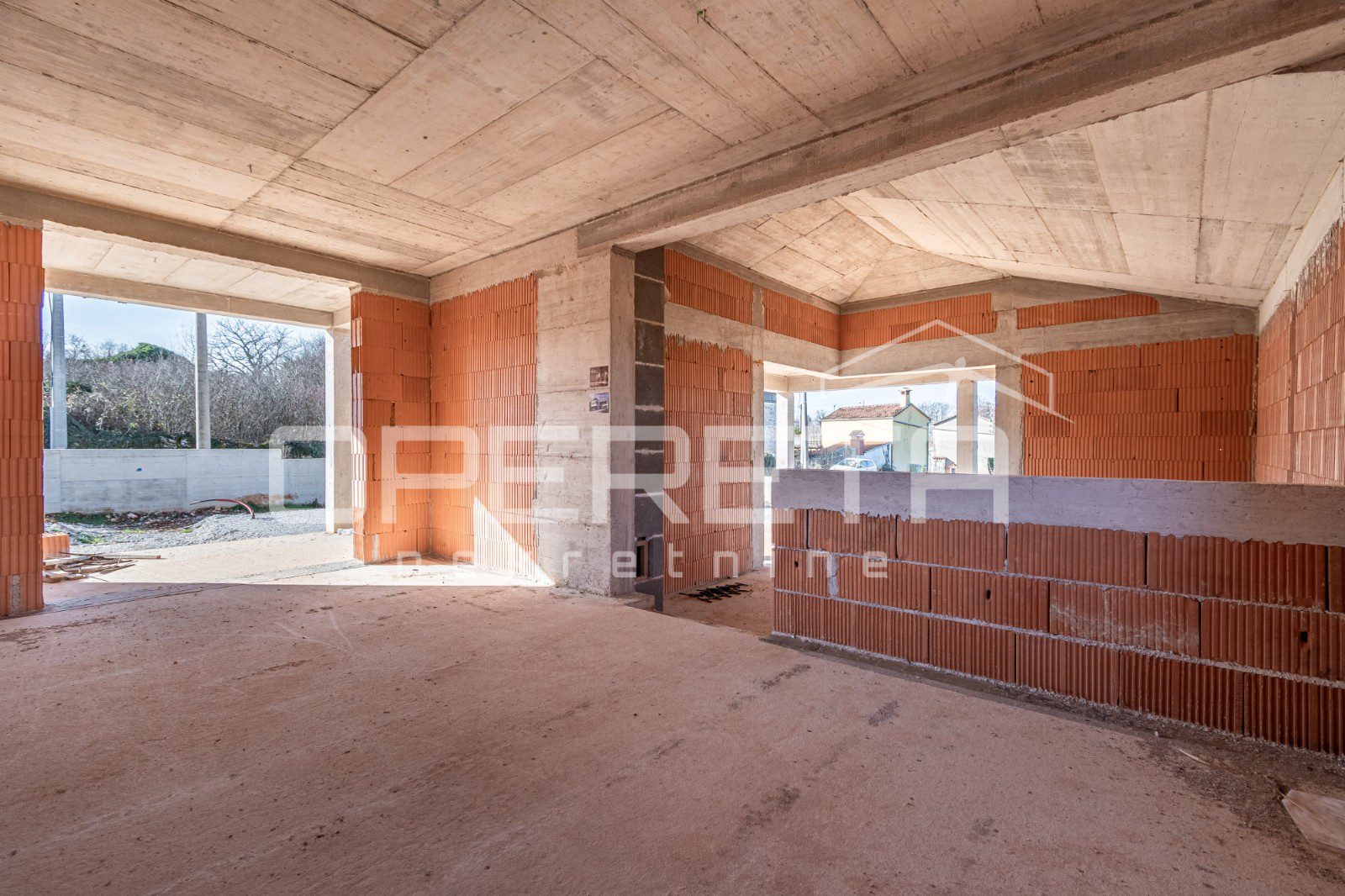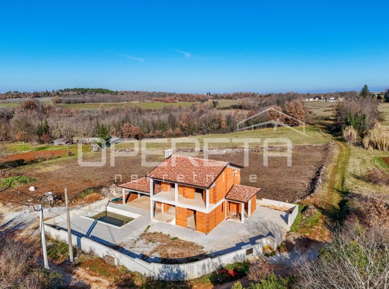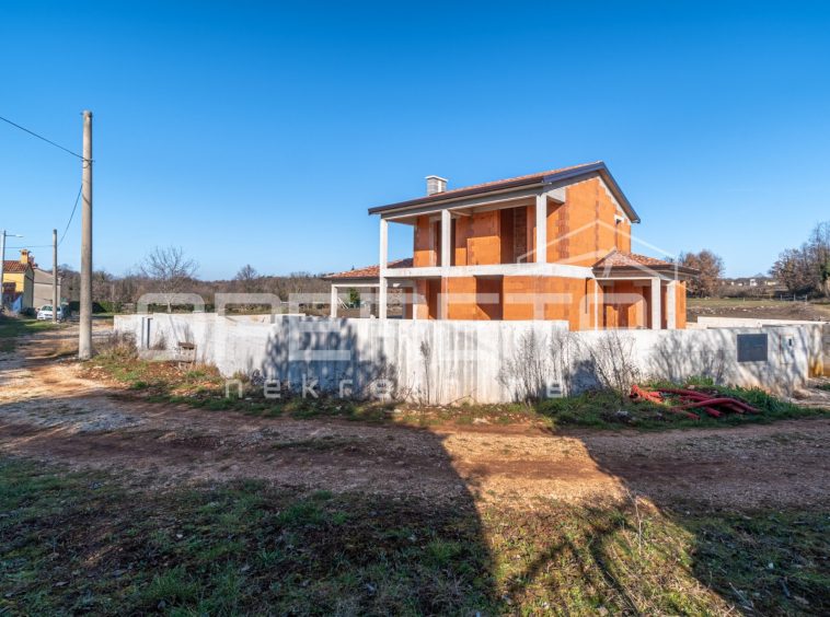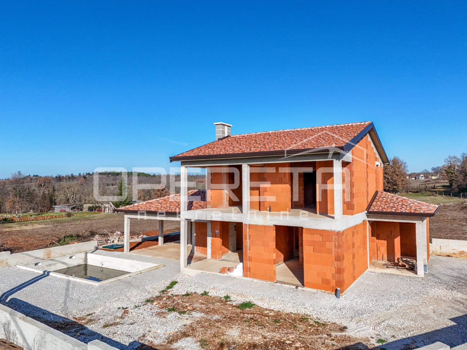 In a quiet location, only 2 km from the center of Višnjan, a detached house in the unfinished (roh-bau) phase of construction is for sale. The total area of the property is 165 m2, and the living space is functionally distributed over two floors. The ground floor comprises a spacious living room with a kitchen and dining area featuring access to the terrace, one bedroom with its own bathroom, a guest toilet, and a storage room. On the first floor, there are two more bedrooms, each with its own bathroom and access to a shared terrace. The house is situated on a plot of 555 m2, which also features a swimming pool of 28 m2. The property is sold in its current condition, offering the new owner the opportunity to finish the interior design according to their own wishes, while electricity and water connections are already included in the price.