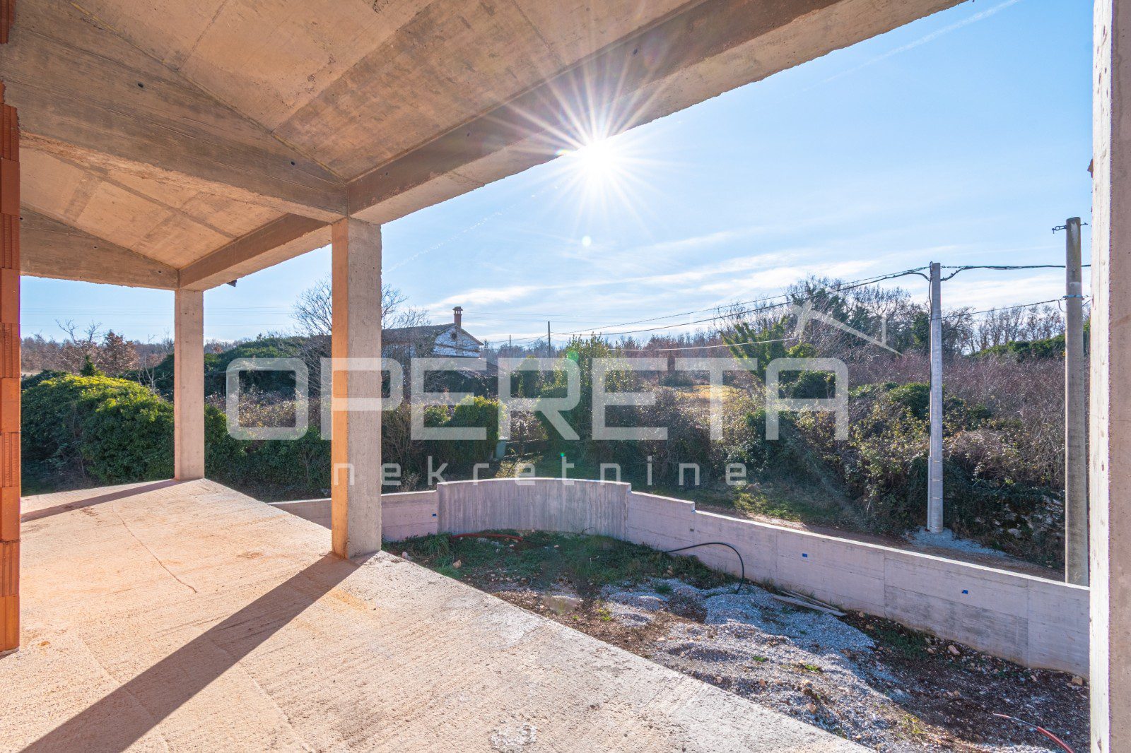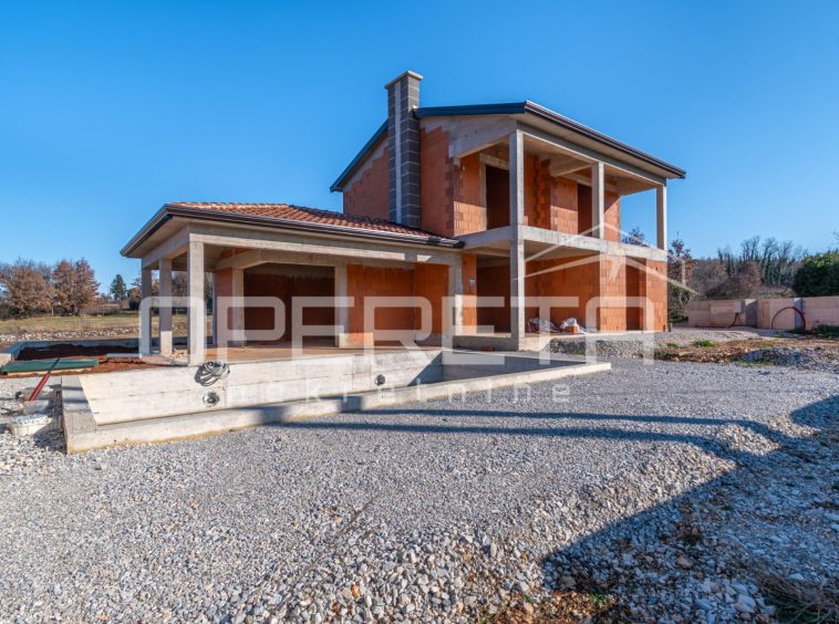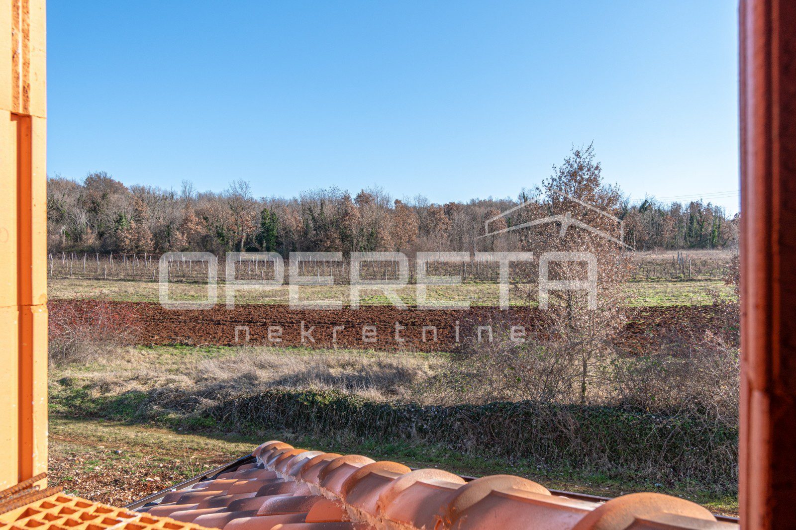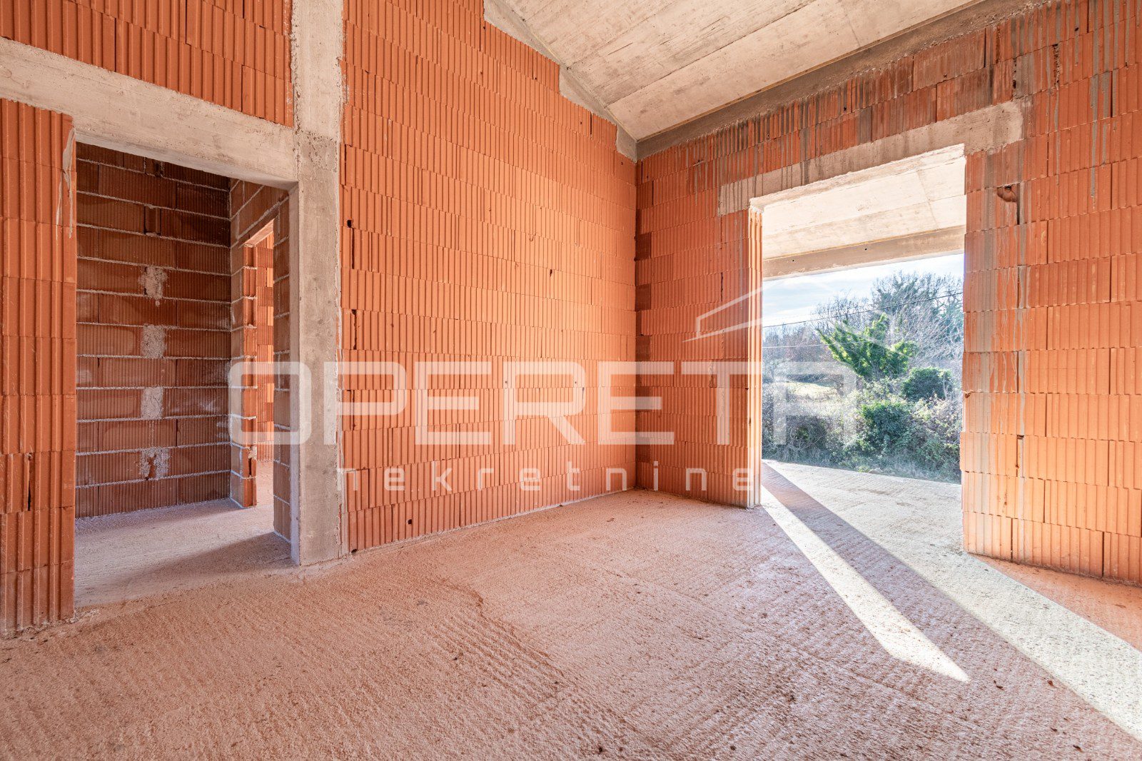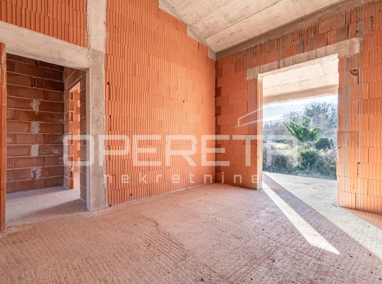 In a quiet location, only 2 km from the center of Višnjan, a detached house in the unfinished (roh-bau) phase of construction is for sale. The total area of the property is 165 m2, and the living space is functionally distributed over two floors. The ground floor comprises a spacious living room with a kitchen and dining area featuring access to the terrace, one bedroom with its own bathroom, a guest toilet, and a storage room. On the first floor, there are two more bedrooms, each with its own bathroom and access to a shared terrace. The house is situated on a plot of 555 m2, which also features a swimming pool of 28 m2. The property is sold in its current condition, offering the new owner the opportunity to finish the interior design according to their own wishes, while electricity and water connections are already included in the price.