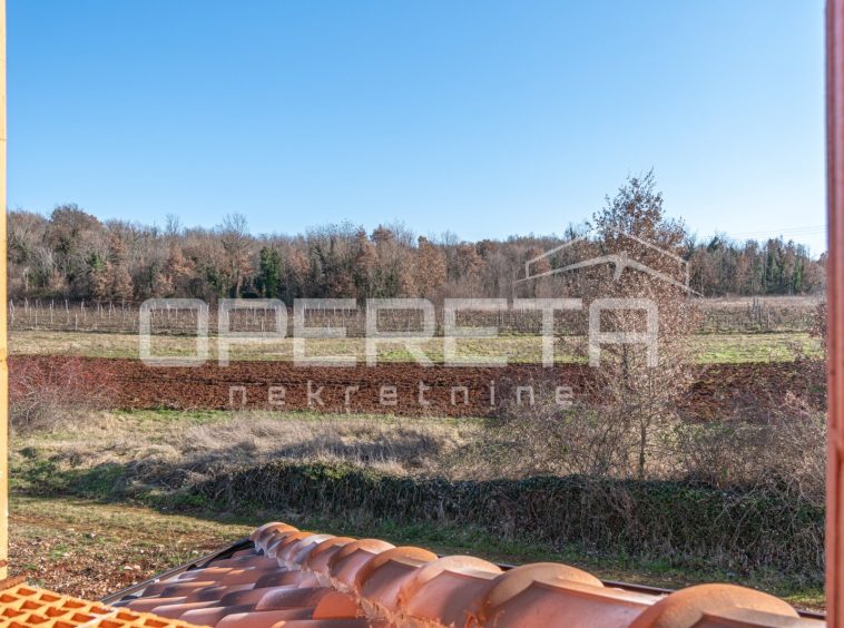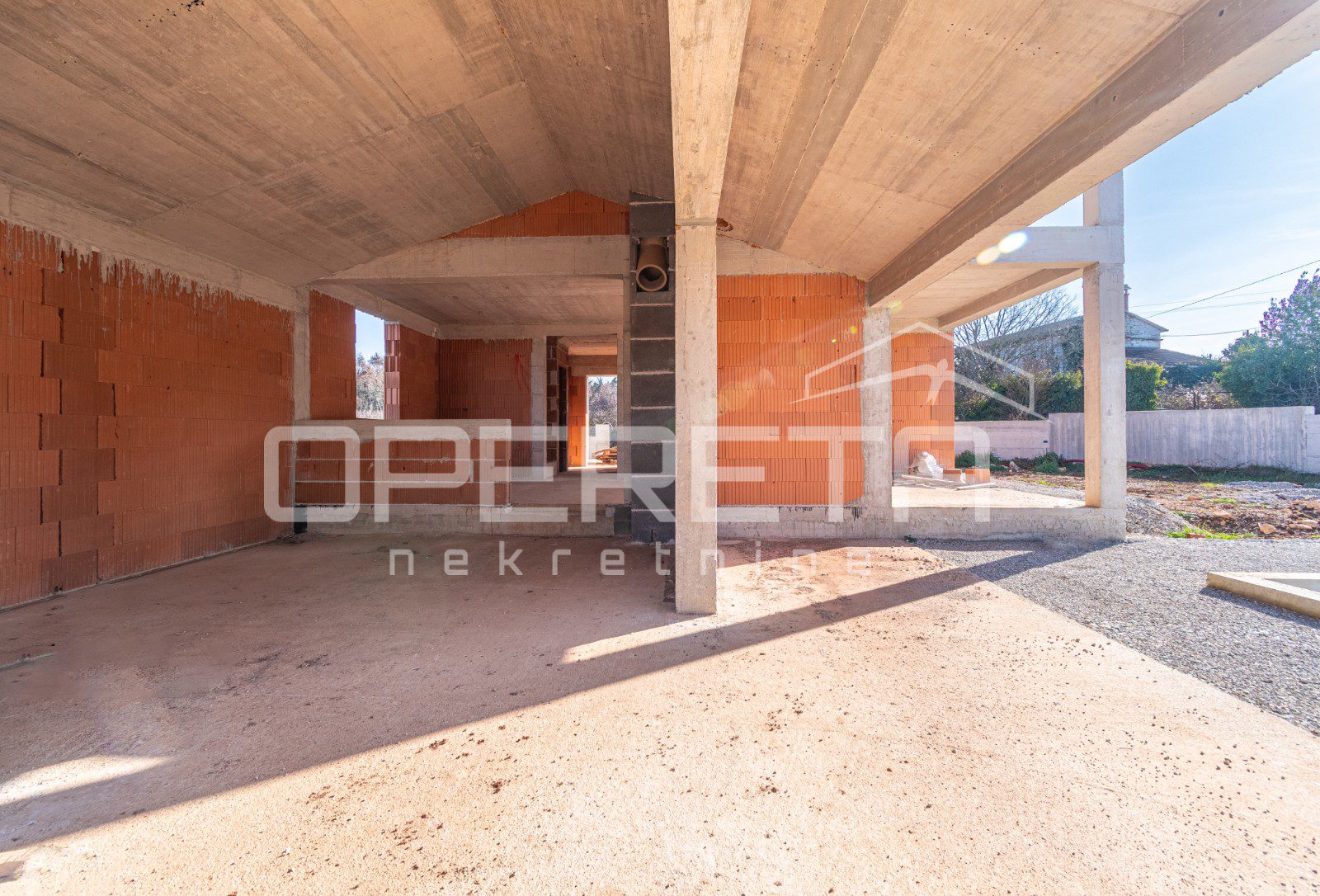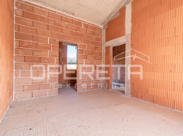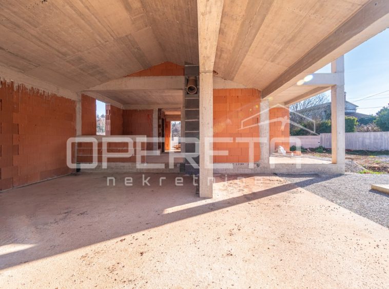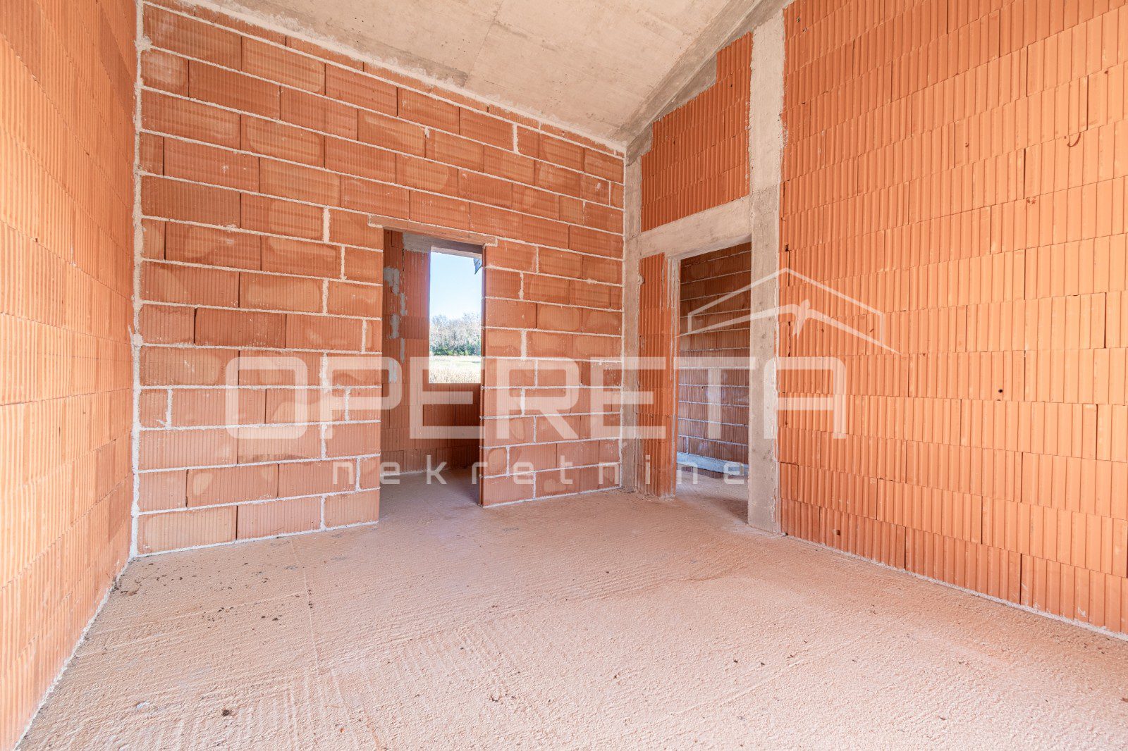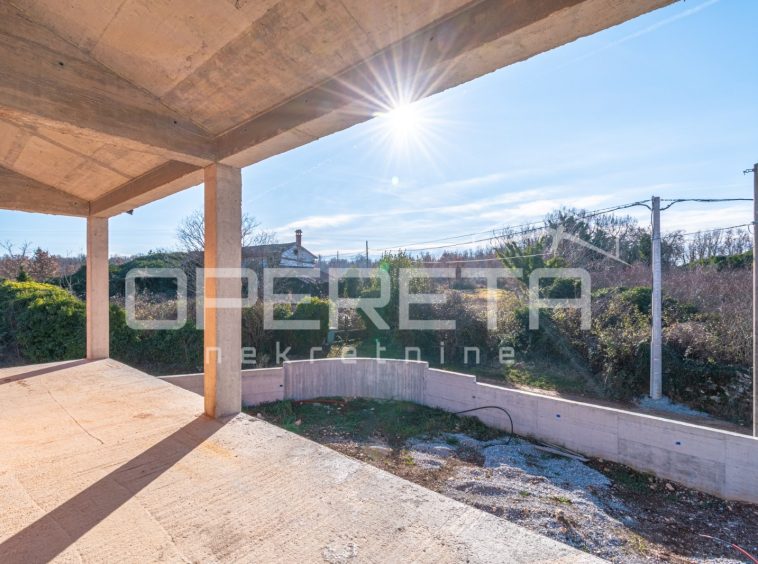 In a quiet location, only 2 km from the center of Višnjan, a detached house in the unfinished (roh-bau) phase of construction is for sale. The total area of the property is 165 m2, and the living space is functionally distributed over two floors. The ground floor comprises a spacious living room with a kitchen and dining area featuring access to the terrace, one bedroom with its own bathroom, a guest toilet, and a storage room. On the first floor, there are two more bedrooms, each with its own bathroom and access to a shared terrace. The house is situated on a plot of 555 m2, which also features a swimming pool of 28 m2. The property is sold in its current condition, offering the new owner the opportunity to finish the interior design according to their own wishes, while electricity and water connections are already included in the price.