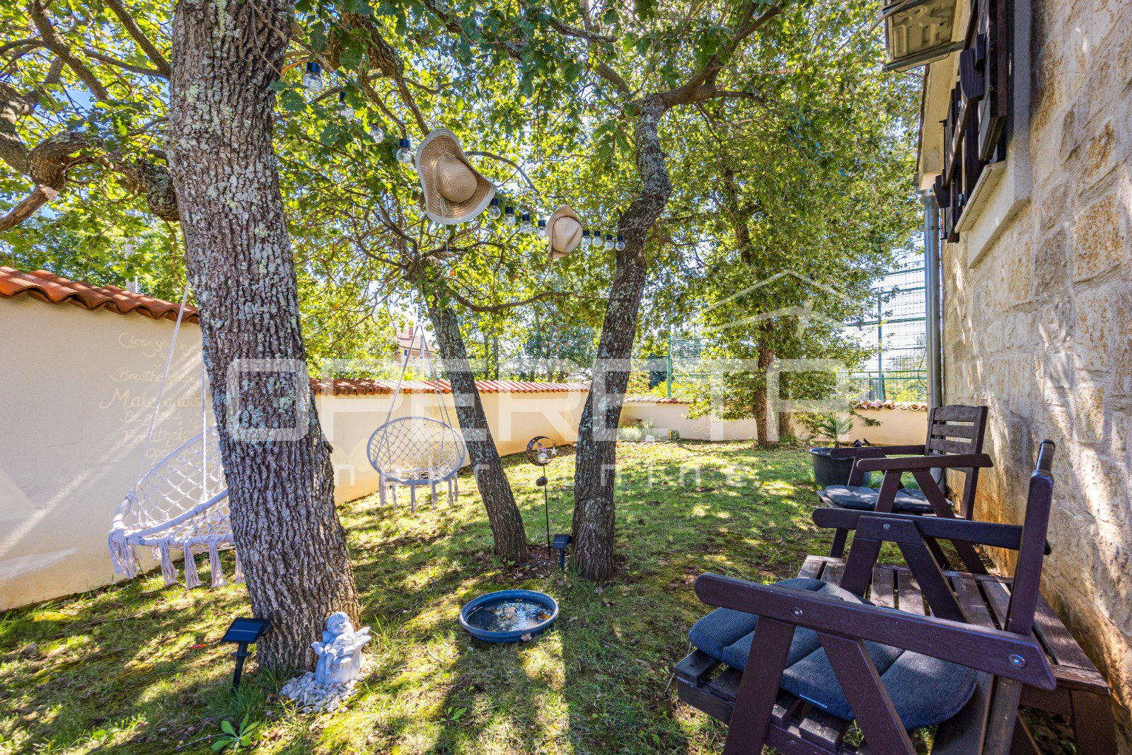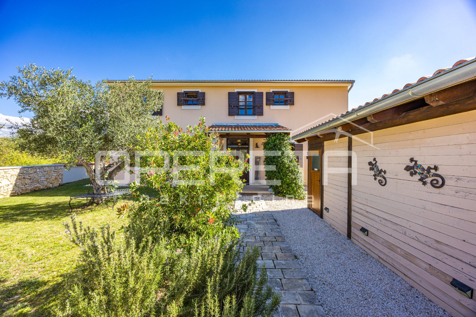 The yard is decorated with Mediterranean plants and olive trees.