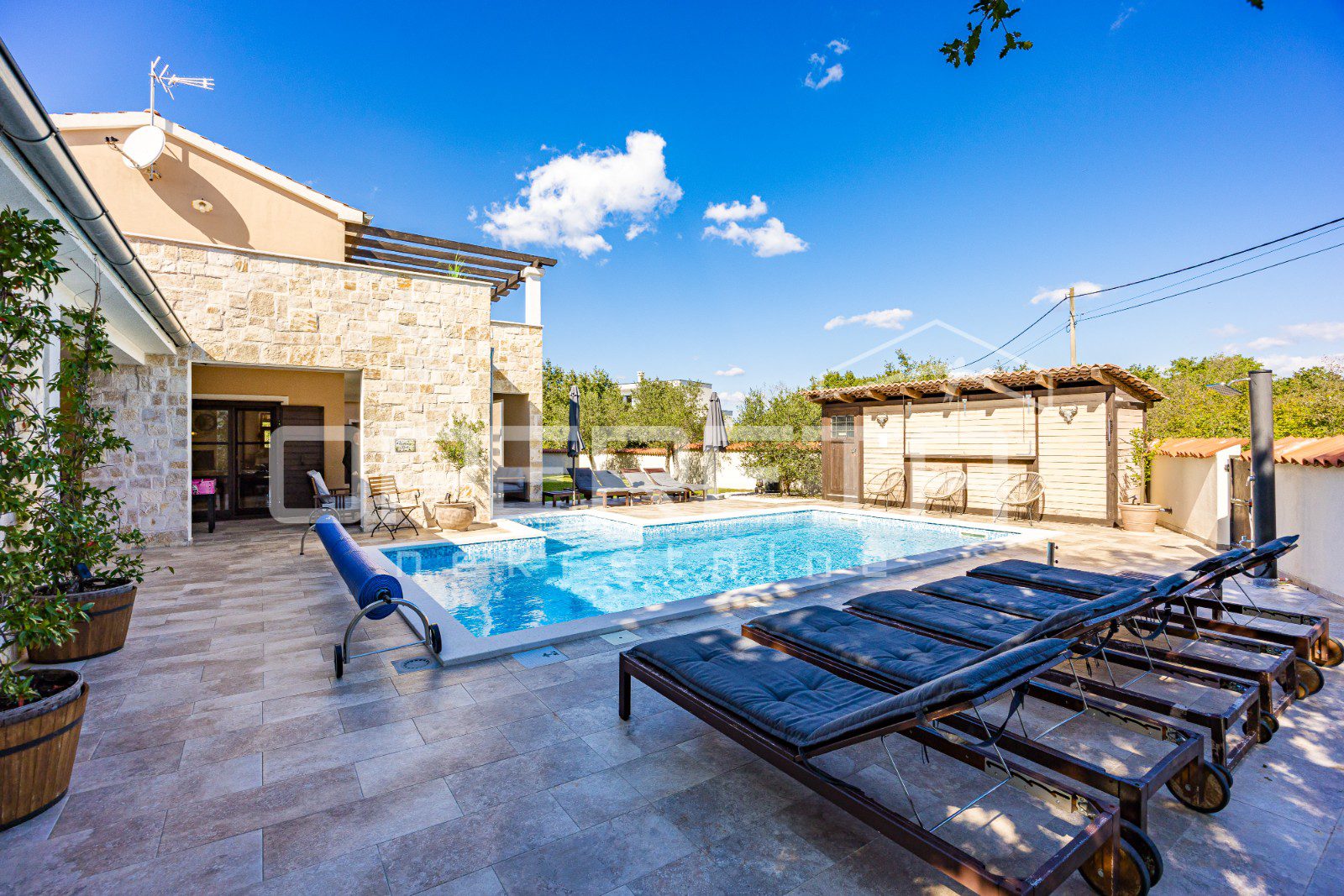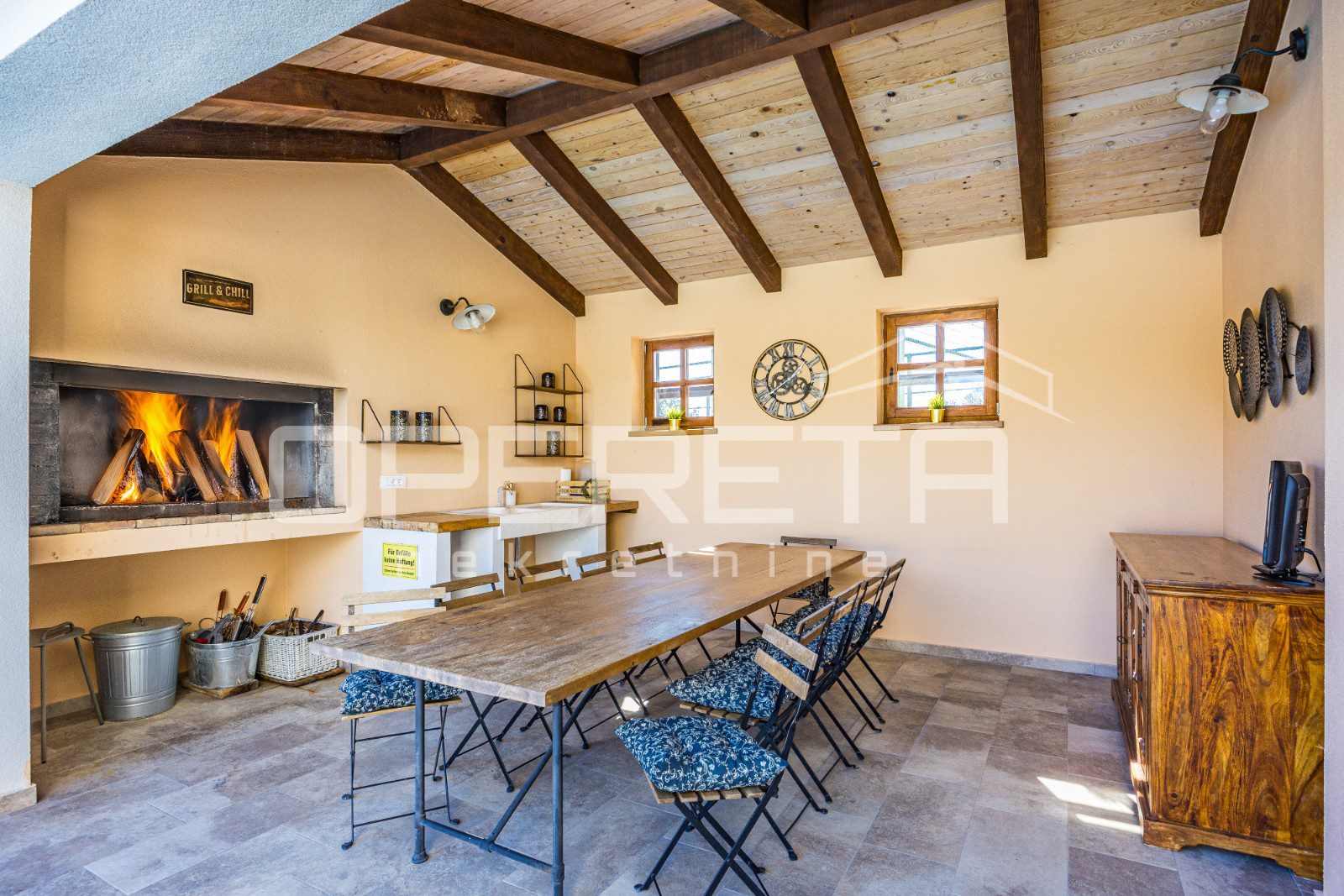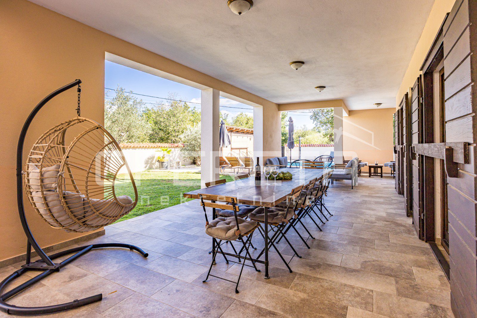 In the extension of the spacious covered terrace, there is a summer kitchen with a socializing area. Furthermore, there is an outdoor toilet and an additional bedroom with its own entrance and bathroom.