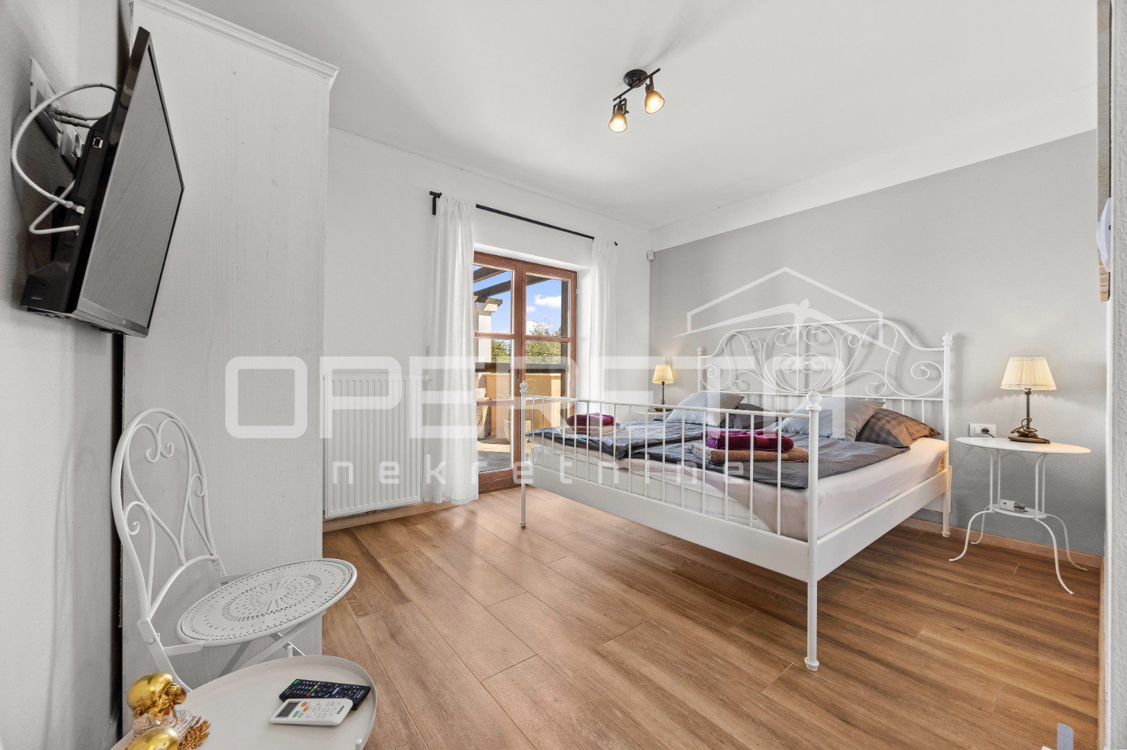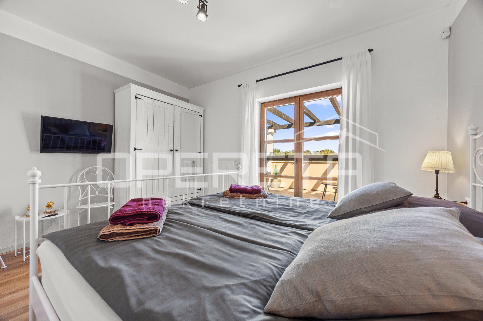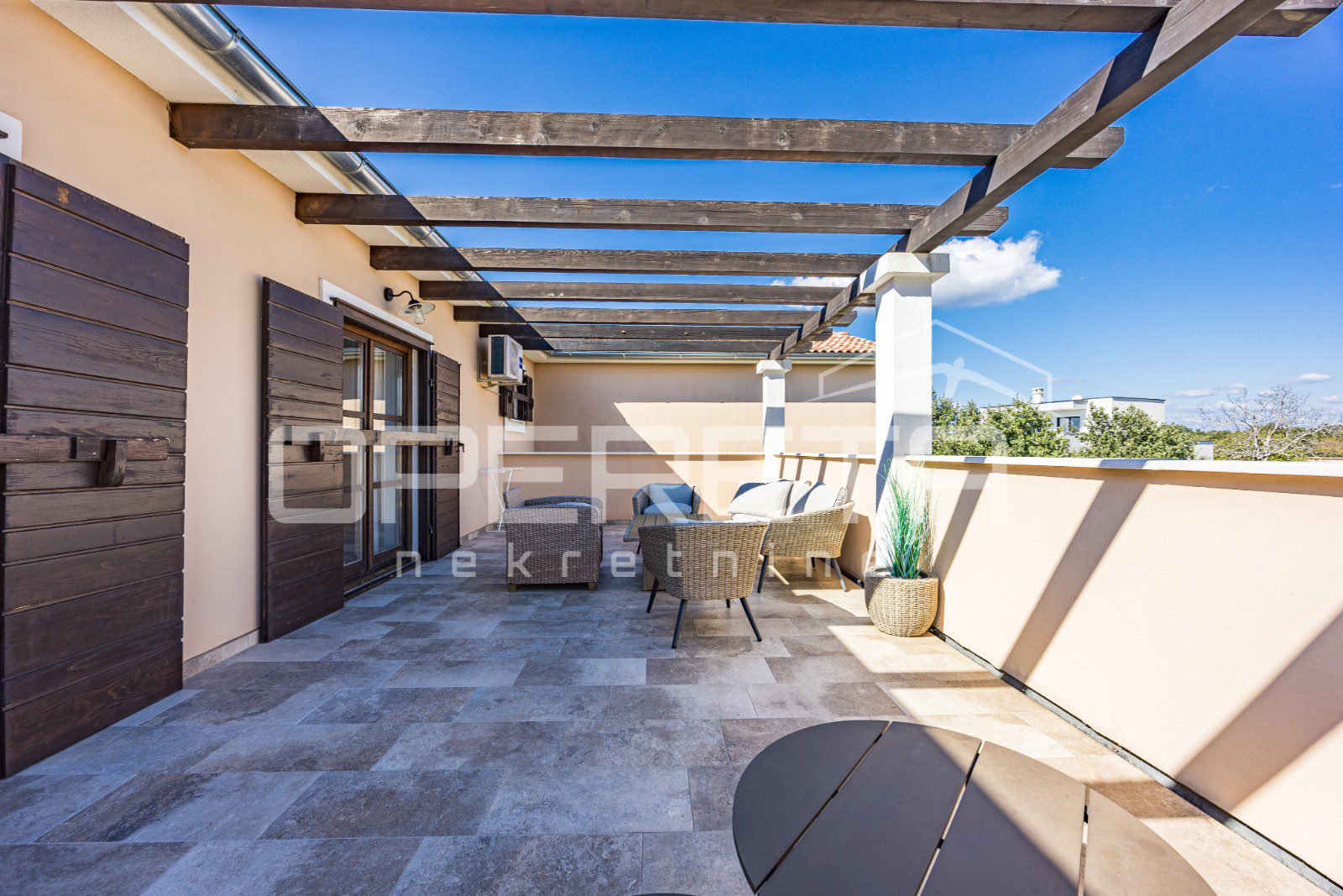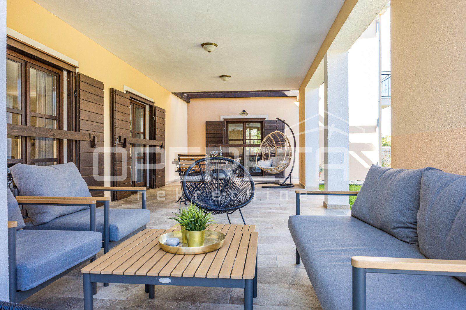 In the extension of the spacious covered terrace, there is a summer kitchen with a socializing area. Furthermore, there is an outdoor toilet and an additional bedroom with its own entrance and bathroom.