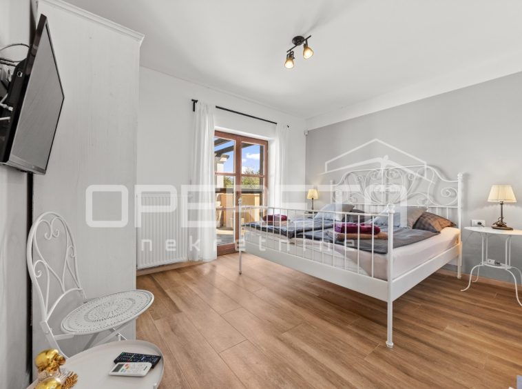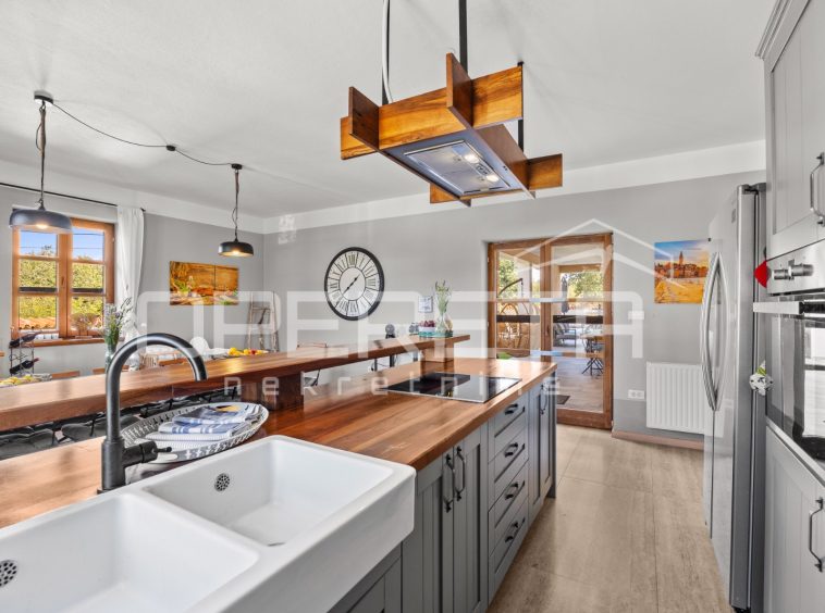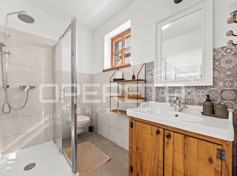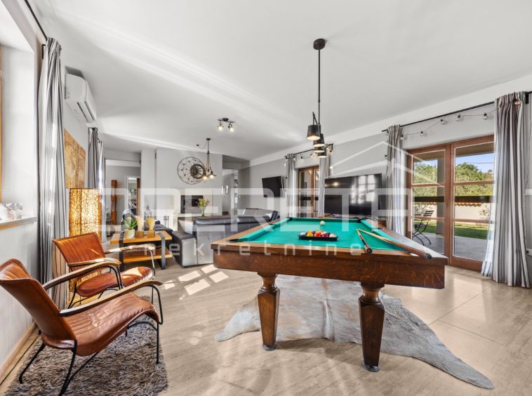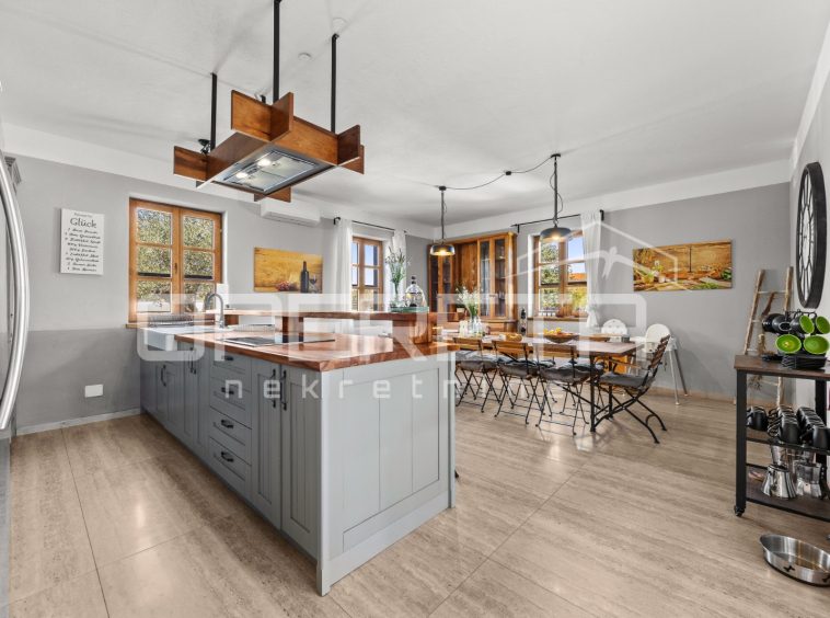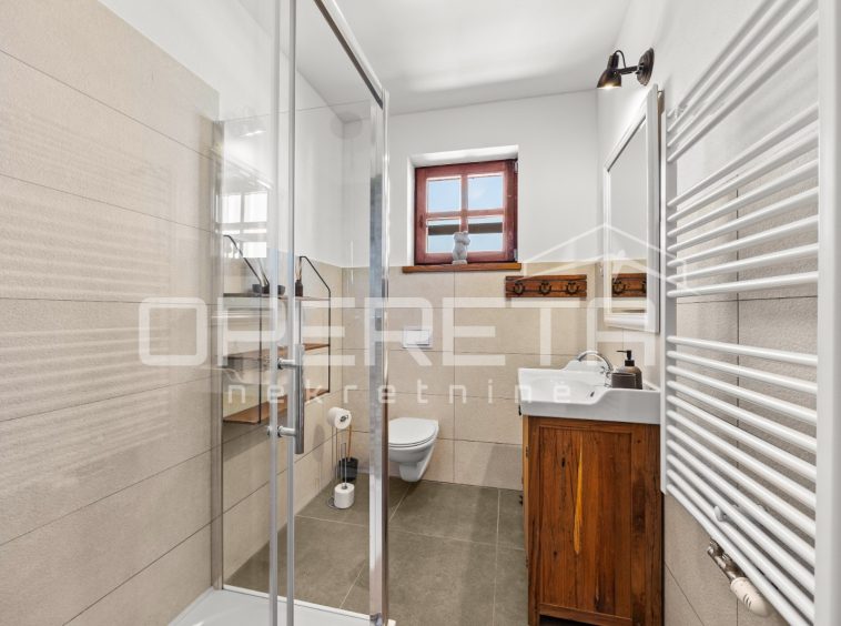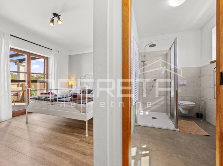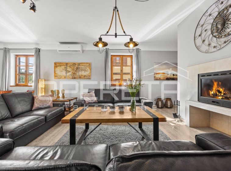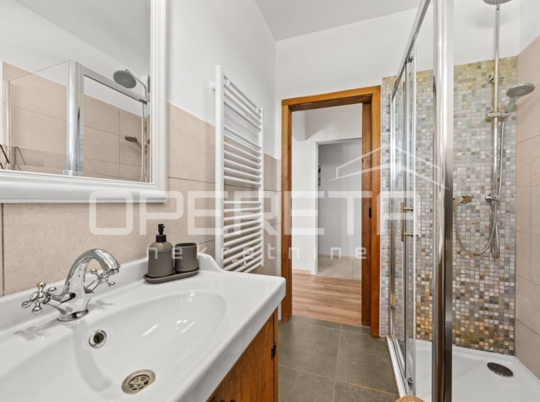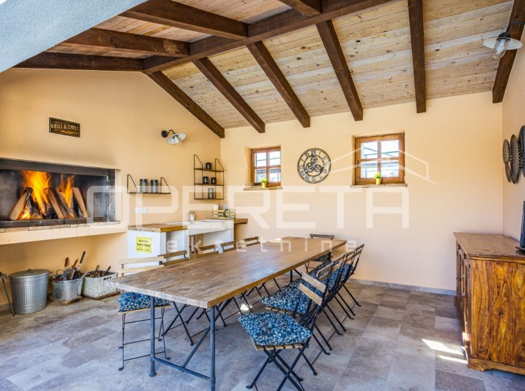 On the ground floor of the villa there is a hallway, a particularly spacious kitchen with a dining room and access to a covered terrace, a spacious living room with a fireplace for additional comfort in winter days, also from the living room there is access to the terrace and the swimming pool sundeck, a bedroom with its own bathroom, and a storage room where the house heating system is located on the principle of a central wood-burning stove that heats the entire house. The first phase of underfloor heating is installed on the first floor.