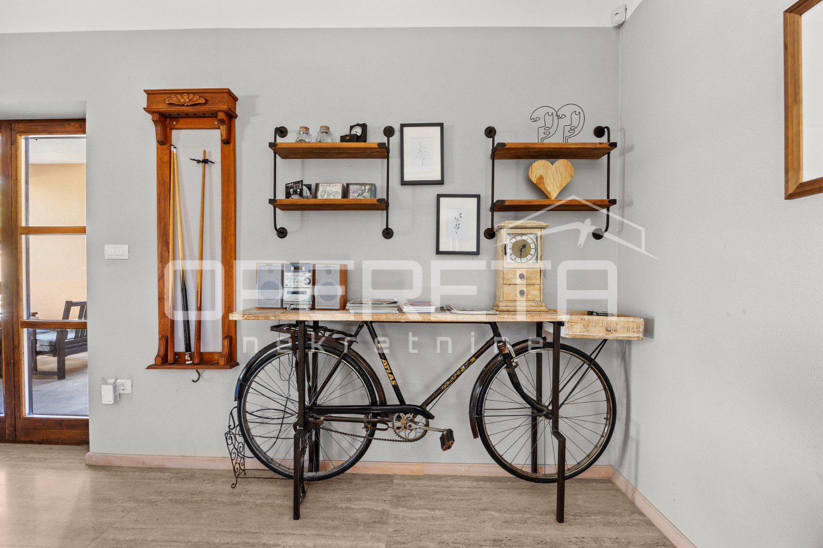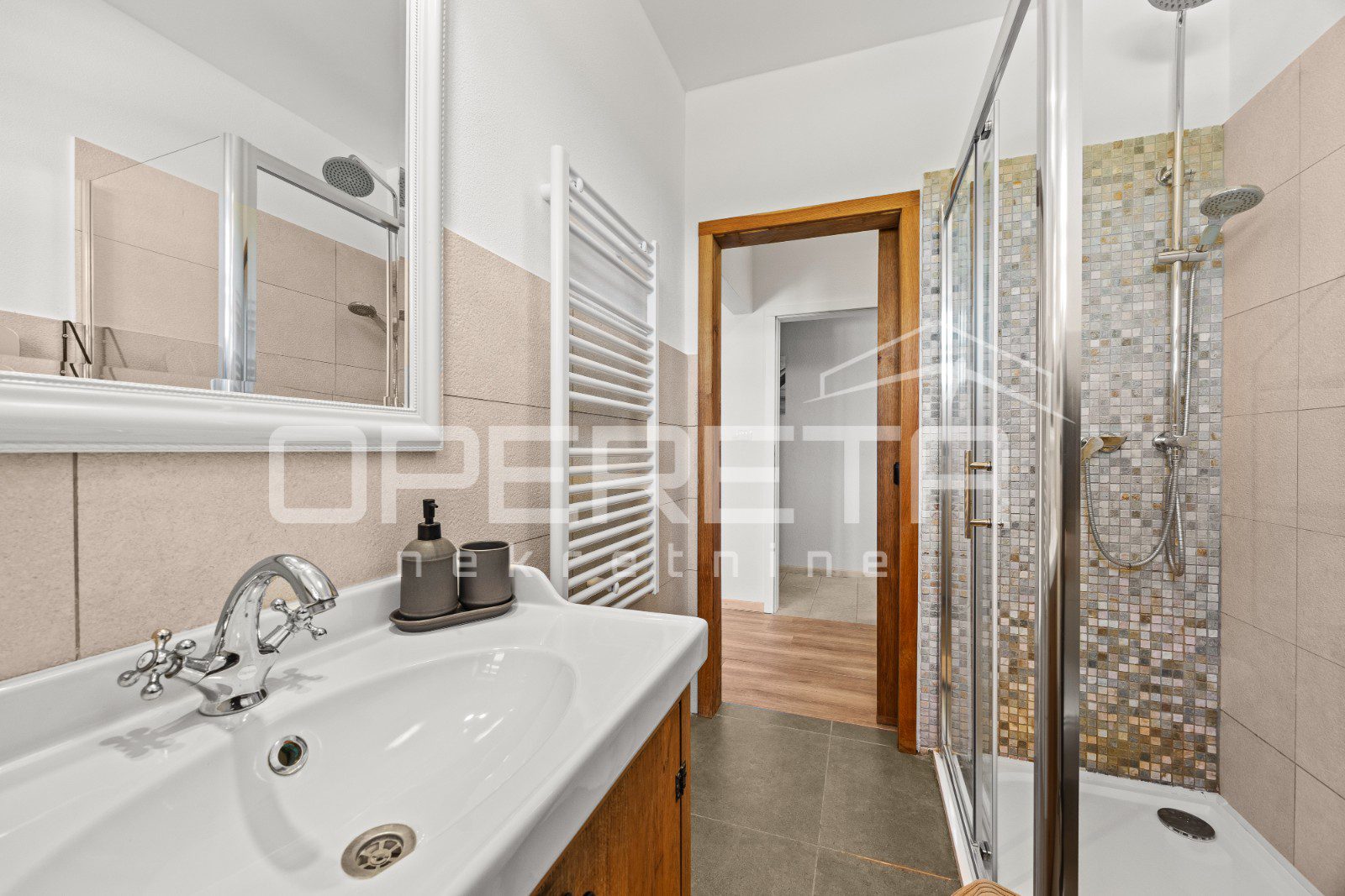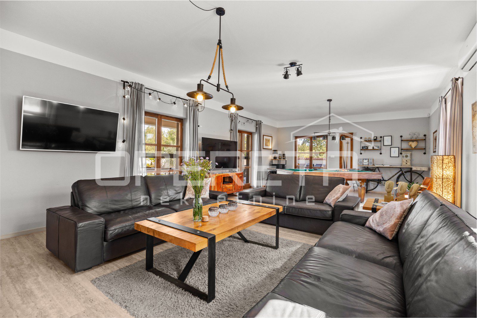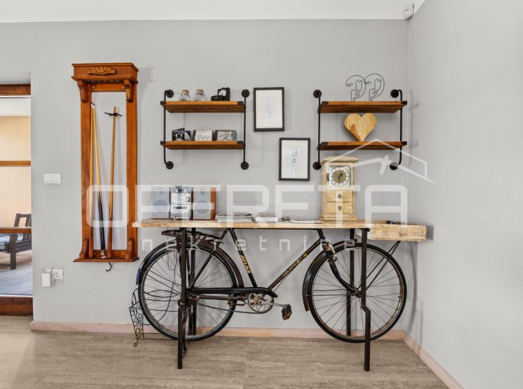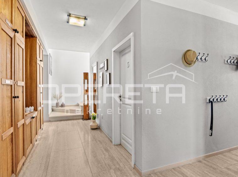 On the ground floor of the villa there is a hallway, a particularly spacious kitchen with a dining room and access to a covered terrace, a spacious living room with a fireplace for additional comfort in winter days, also from the living room there is access to the terrace and the swimming pool sundeck, a bedroom with its own bathroom, and a storage room where the house heating system is located on the principle of a central wood-burning stove that heats the entire house. The first phase of underfloor heating is installed on the first floor.
