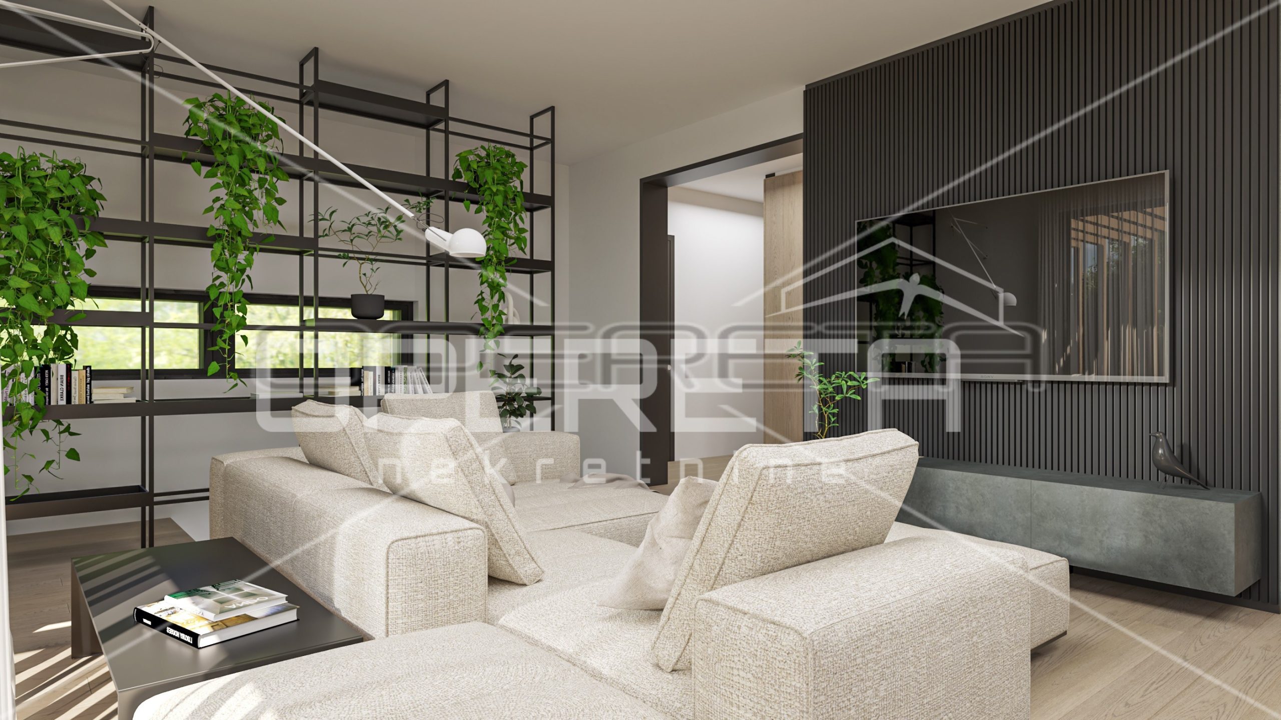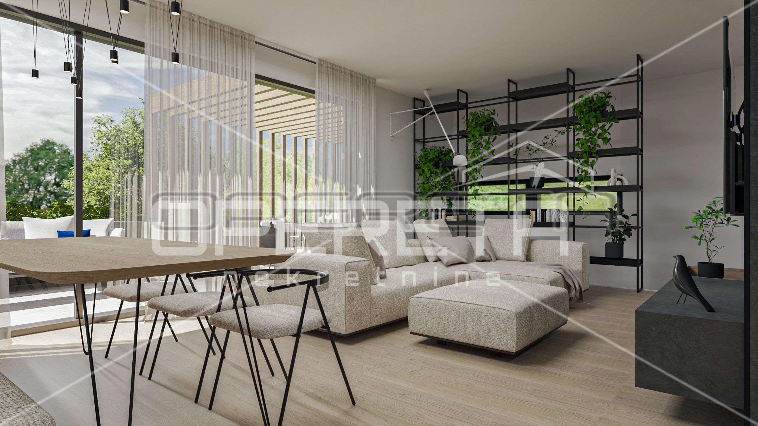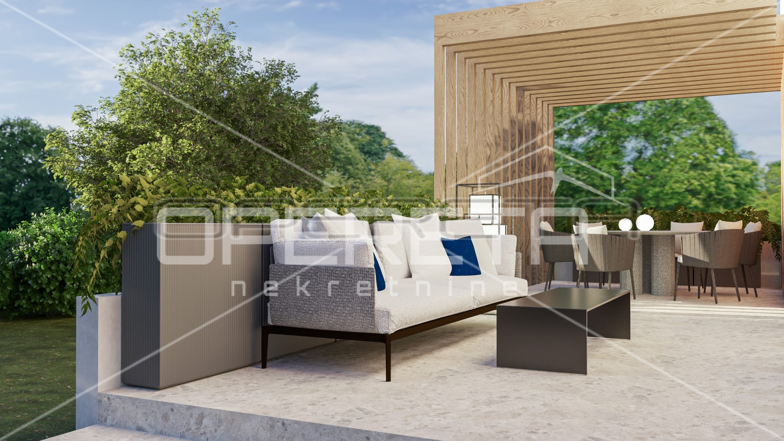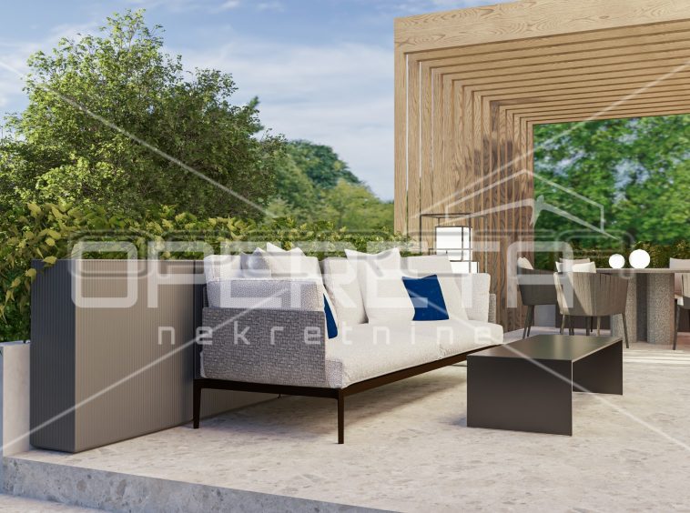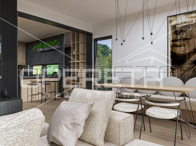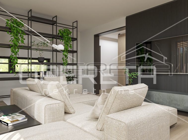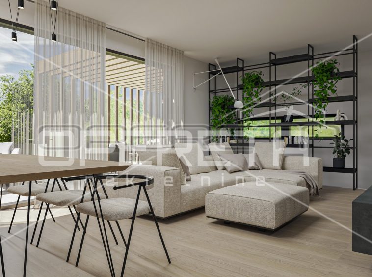 The house consists of a large open-space living room with kitchen and dining room and access to a private terrace and garden, toilet, laundry room and three bedrooms, each with its own bathroom.