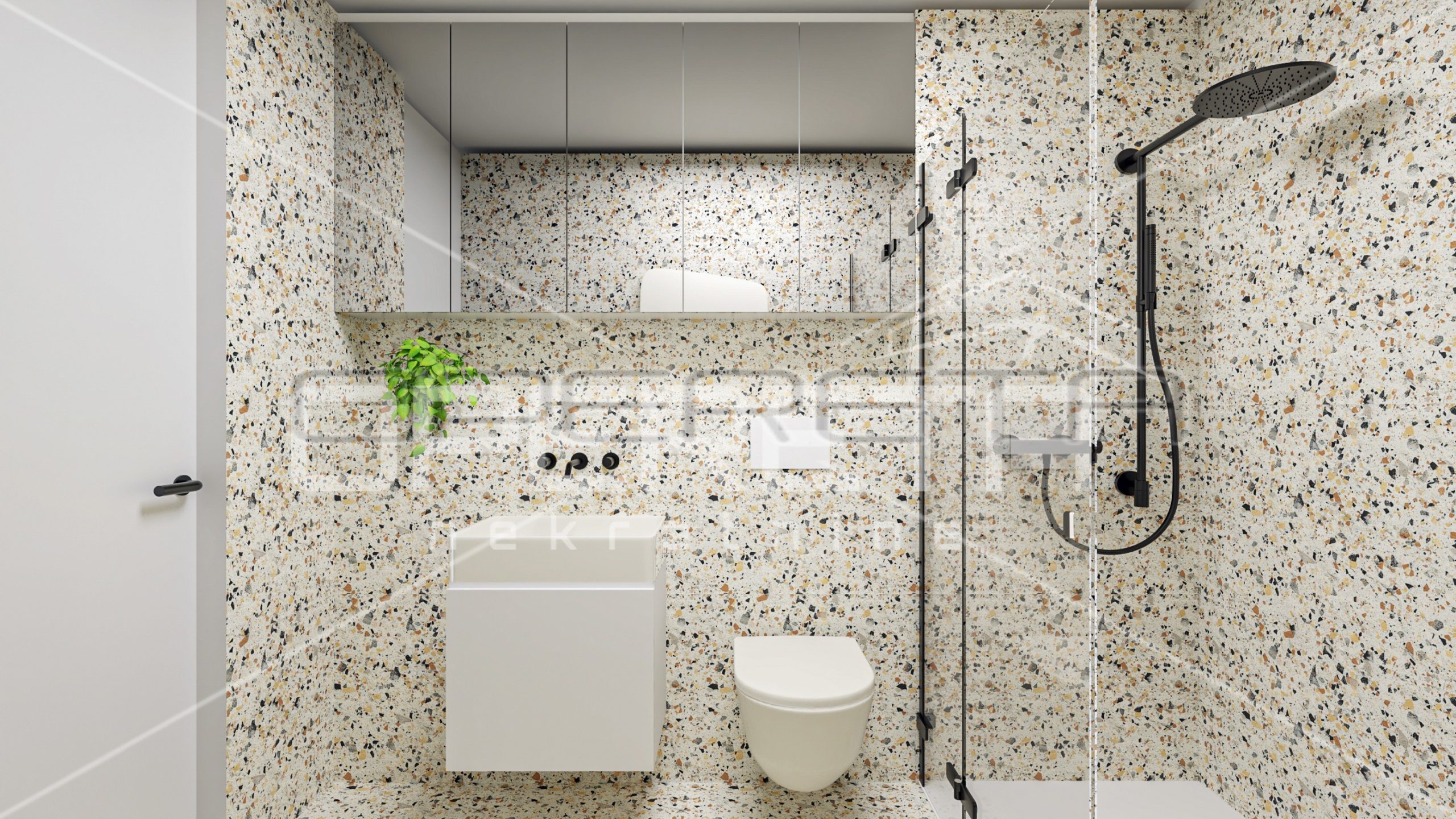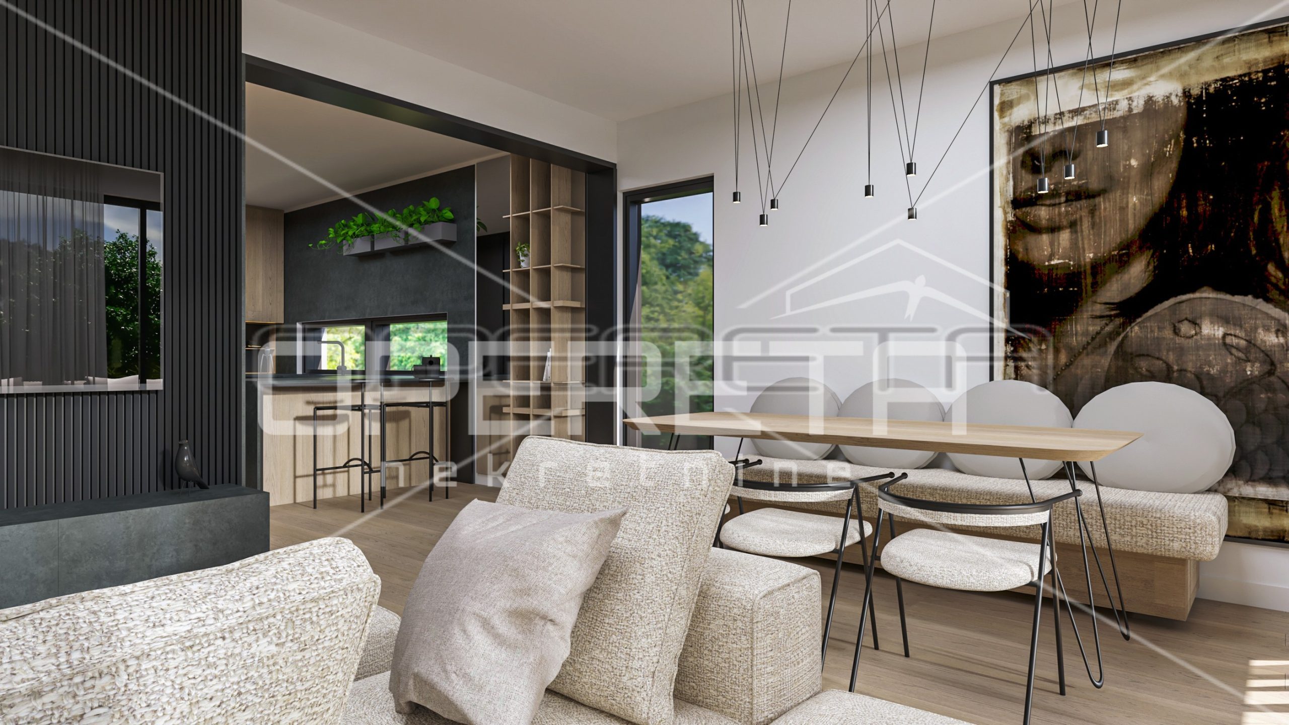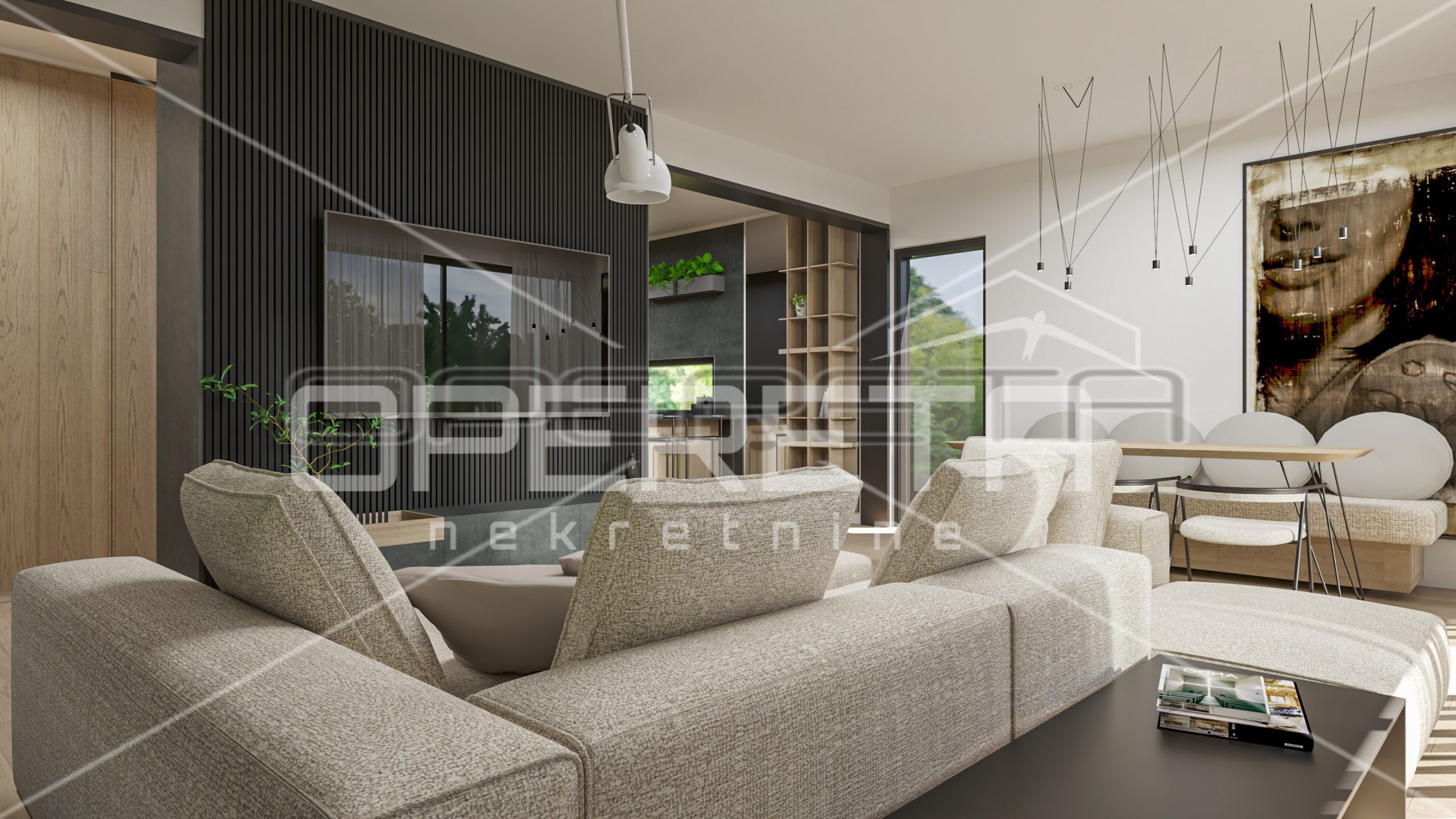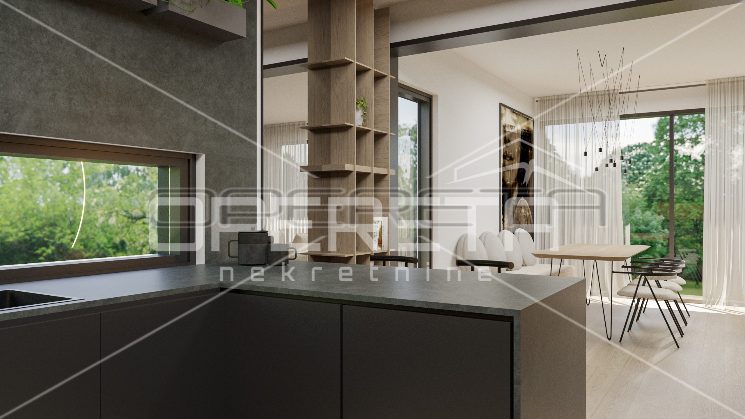 The house consists of a large open-space living room with kitchen and dining room and access to a private terrace and garden, toilet, laundry room and three bedrooms, each with its own bathroom.