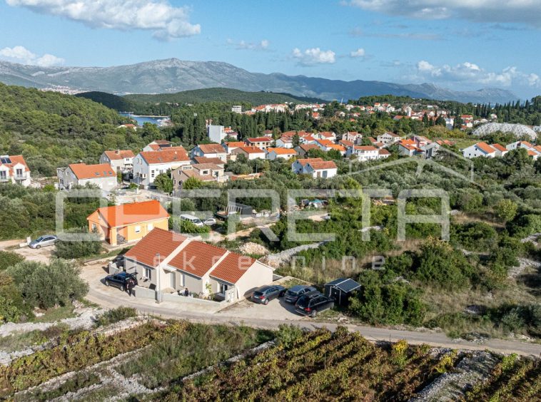 In the immediate vicinity, there is a swimming pool, a children’s playground, and an outdoor gym, while the town center is just a three-minute drive away. The sea can be reached with a ten-minute leisurely walk, and the historic core of Korčula is within a twenty-minute walk.