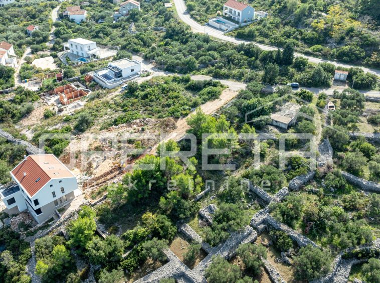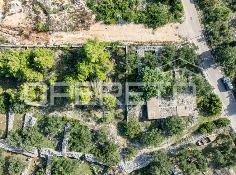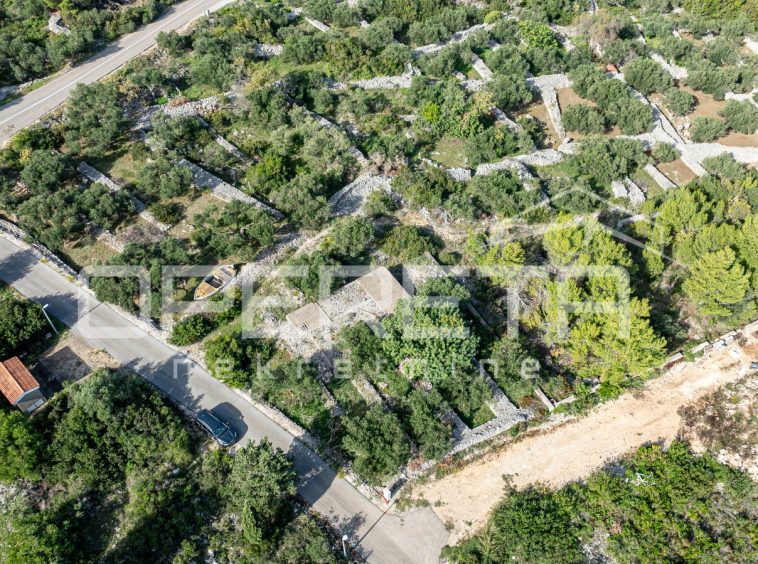 An attractive building plot with a total area of 1,446 m² is located in Lumbarda on the island of Korčula and consists of four connected, rectangular parcels. The location offers a peaceful setting with good access to the town center, which is approximately one kilometer away and provides essential amenities such as shops and restaurants. Access to the property is available via an asphalt road that transitions into a gravel road, and utility connections (water and electricity) are located nearby, simplifying preparations for construction.