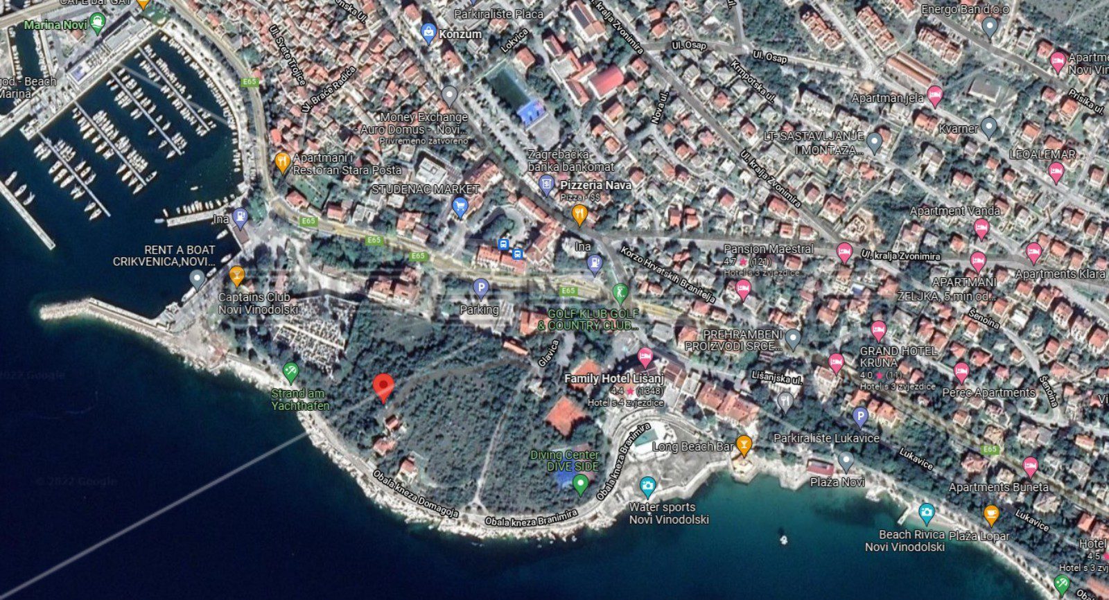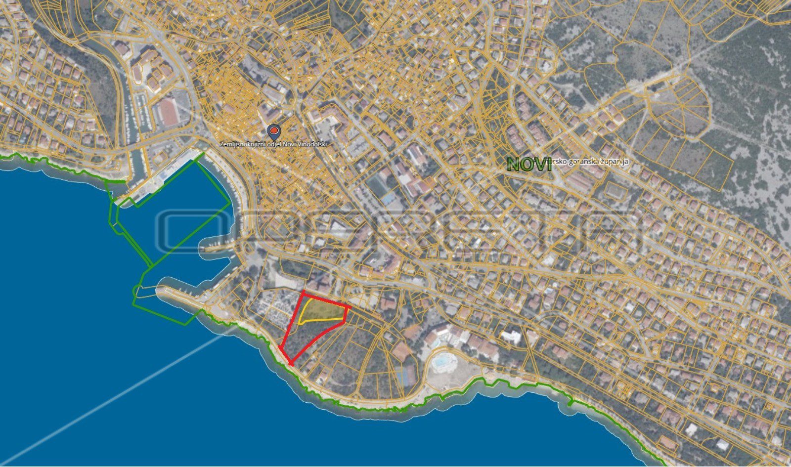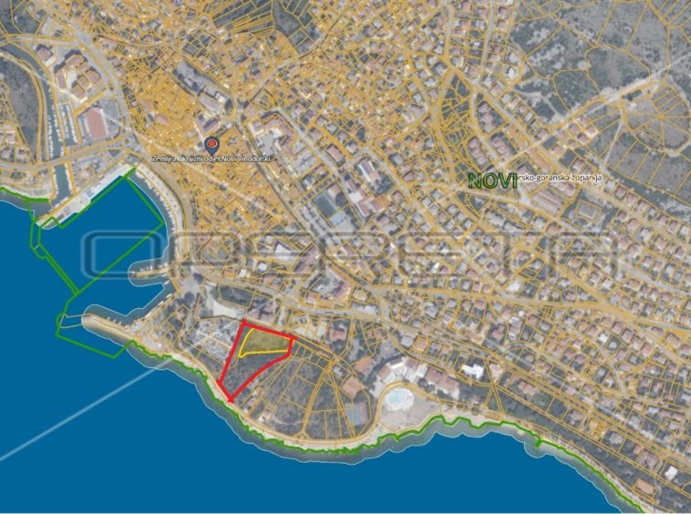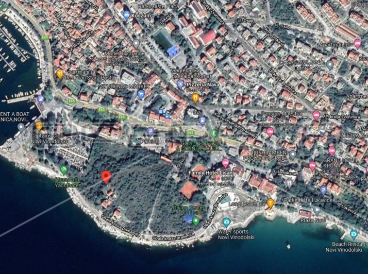The investment land with a total area of 10,500 m2 is for catering and tourism purposes and is located in the first row to the sea near the beaches in Novi Vinodolski. On the land there is a possibility of building a hotel with 8 above-ground floors (calculated from the lowest elevation of the landscaped terrain) or 4 above-ground floors (calculated from the highest elevation of the landscaped terrain) with about 642 beds. A permit for an access road with lighting has been obtained.