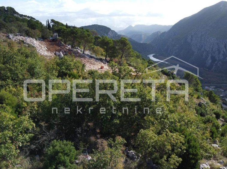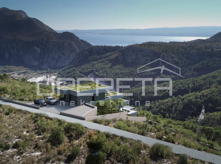In Gata, a peaceful village at the foot of Mount Mosor, just ten kilometers from Omiš, there is a spacious plot of 1,546 m² with a completed project for a contemporary residential villa with a swimming pool. Its location within a new residential settlement provides context with high-quality neighboring houses, while the houses themselves are situated below the plot, leaving panoramic views of the Adriatic Sea and the Cetina River canyon completely unobstructed. The micro-environment offers privacy, greenery, and a sense of seclusion, while still being a short drive from beaches, shops, and amenities in Omiš.