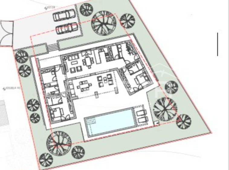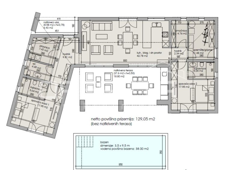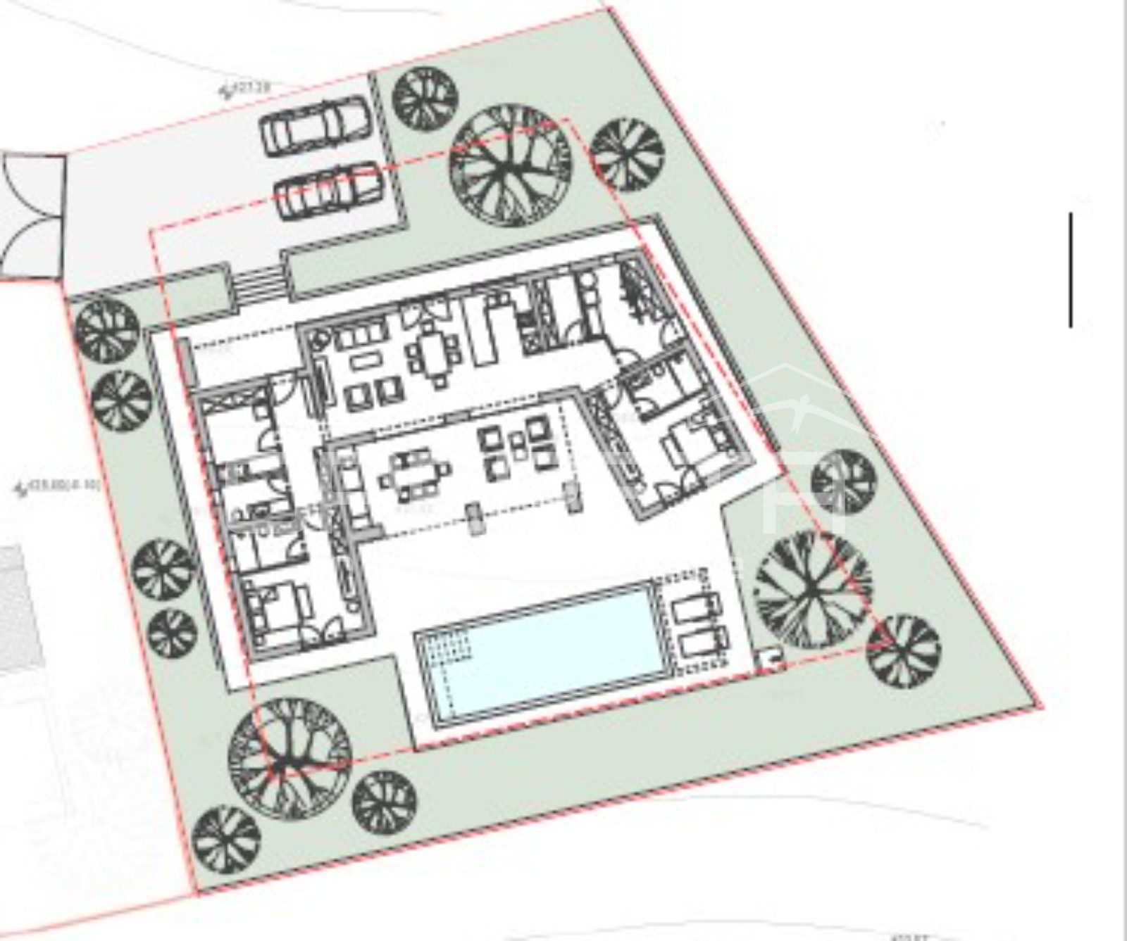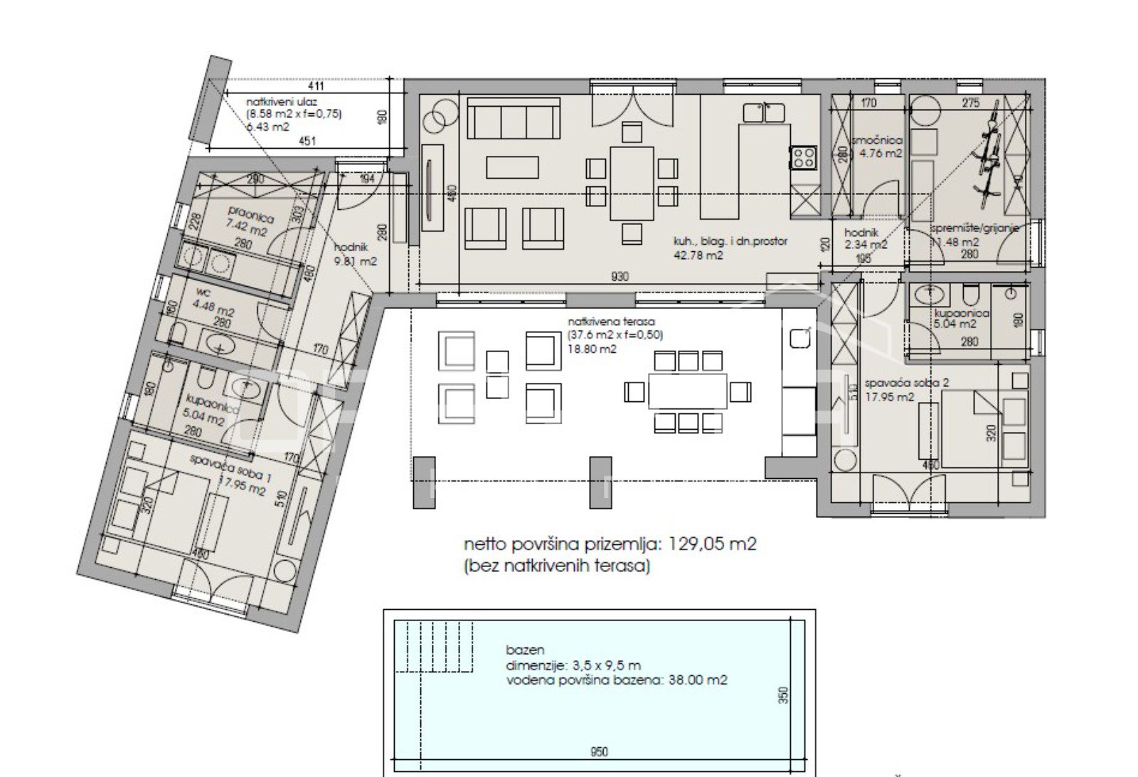 A conceptual design (idejno rješenje) has already been prepared for the plot, featuring a modern, single-story house (prizemnica) of 129 m² and an accompanying swimming pool of 38 m².