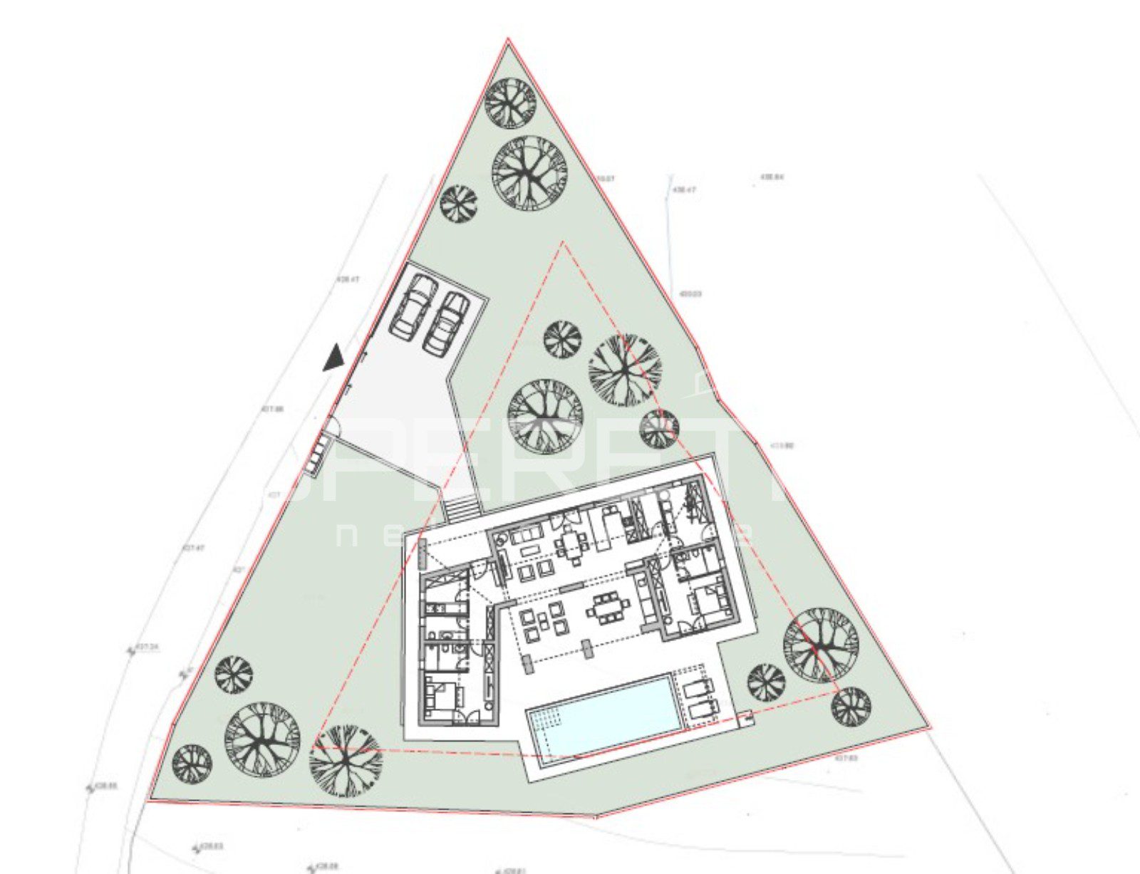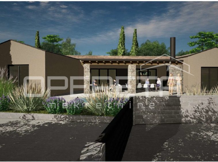 A conceptual design (idejno rješenje) has already been prepared for the plot, featuring a modern, single-story house (prizemnica) of 129 m² and an accompanying swimming pool of 38 m².